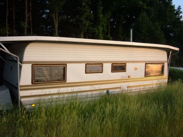 Wohnwagen Corsar 820 cm Bauj. 1979, 5 Schlafplätze, mit Überdach, Vorzelt mit festem Sturmgestänge und richtiger Tür (abschließbar) und reichhaltigem Inventar, Geräteschuppen (aus Holz), Platzgröße ca. 80-100 qm (Eckgrundstück direkt am Wald) ruhige Lage auf Ganzjahresplatz mit Badesee und Sandstrand am Lütauer See (Lauenburgische Seenplatte). Gaststätte und Verkaufsladen auf dem Platz.