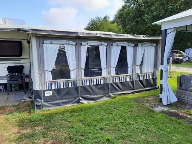 Winterfestes Vorzelt mit Sitzplätzen für vier Personen, Küchenzeile mit neuen Induktionsplatten und Vorzeltheizung (Gas).
