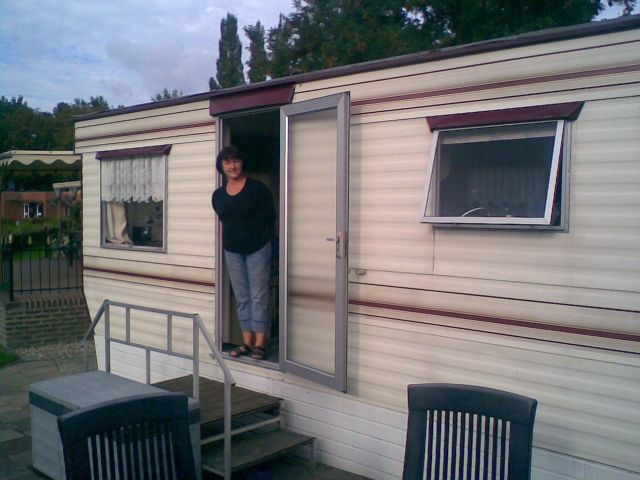 Mobilheim auf Ganzjahrescampingplatz in Enschede(NL) direkt hinter Grenze Gronau abzugeben. 9 m lang, 3, 30 m breit, 2 SZ, mit Holzhütte, hier kann man auch schlafen, und Geräteschuppen, dazu 3 Fahrräder.