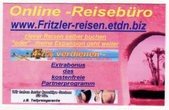 Aufgepaßt! Schnäppchenreisen.Sparen ist in! Buchen Sie online Ihre Urlaubsreise - preisgünstig und schnell, mit direktem PreisvergleichLast Minute, Charterflüge, Mietwagen, Ferienhäuser überall, auch in DK und mitPool, Golfreisen, Ferienparks, Wellness-, Romantik- und Gourmetreisen.Das ETDN-Reiseportal hat alle seriösen und soliden Veranstalter im Programm, so dass der direkte Preisvergleich durch Sie selbst unmittelbar problemlos möglich ist.http:/ / www.Fritzler-reisen.etdn.bizUnd auch noch Geld verdienen mit unserem Partnerprogramm